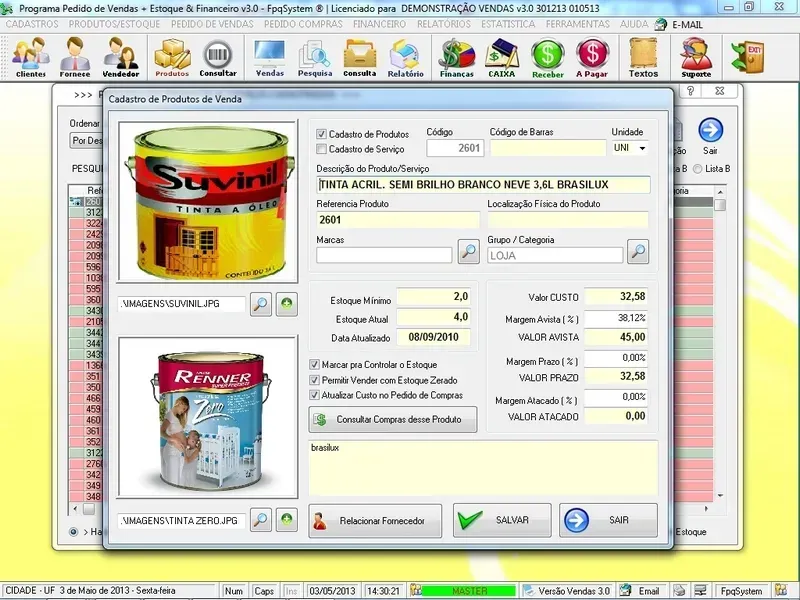 Gestão de Produtos: Mantém um registro de todos os produtos disponíveis para venda, incluindo detalhes como descrição, foto do produto, preço, quantidade em estoque minimo e atual, margem e fornecedor.
