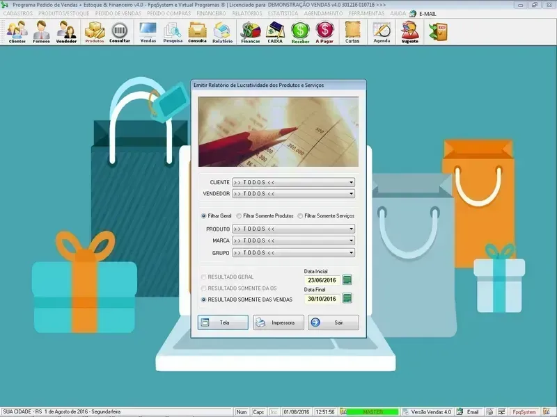 Controle de Estoque / Vendas / Orçamento / Clientes / Fornecedores / Vendedores / Relatório de Vendas / Aniversariantes / Personalizar Fundo de Tela / Personalizar Logomarca + Acesso por nível de usuário + Compras + Financeiro + Foto nos Produtos + Reajuste de Preços em bloco