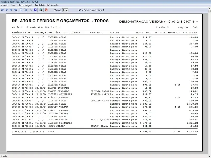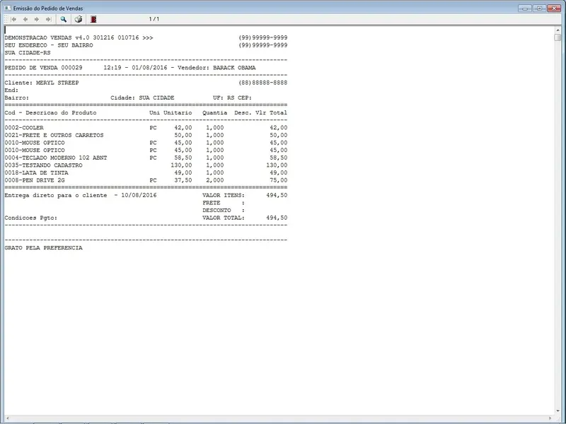 Geração de Pedidos: Permite aos usuários criar pedidos de vendas para clientes, controle de entregas, selecionando produtos, especificando quantidades, aplicando descontos, com impressão do pedido em A4 ou cupom não fiscal.