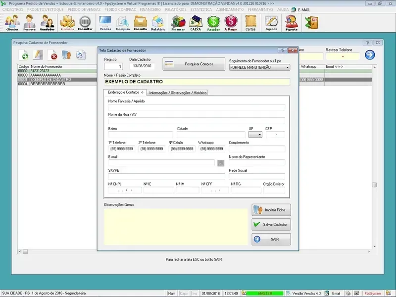 Gestão de Fornecedores: Mantém um registro de informações sobre os fornecedores, como detalhes de contato, histórico de compras, termos de pagamento, etc.