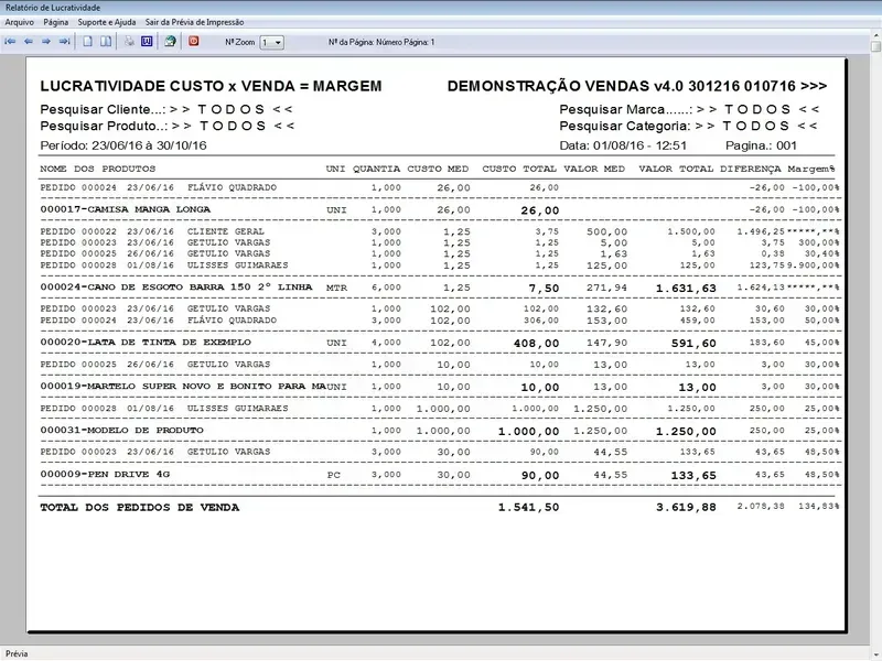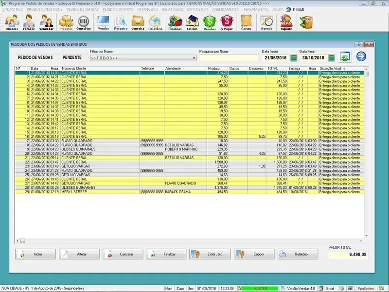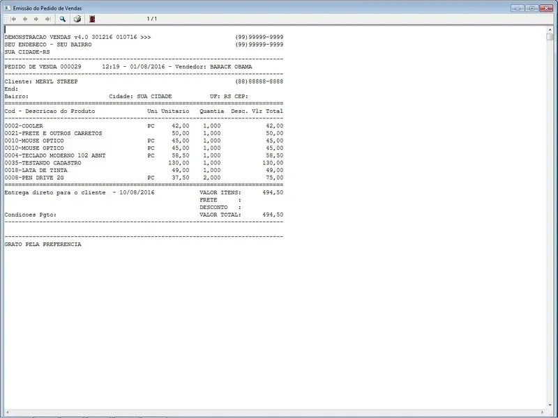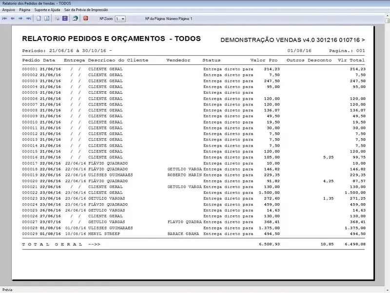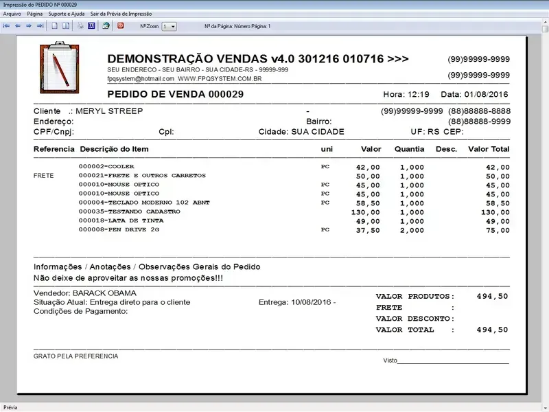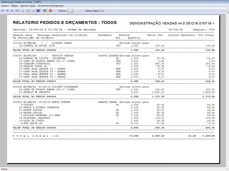 Geração de Pedidos: Permite aos usuários criar pedidos de vendas para clientes, controle de entregas, selecionando produtos, especificando quantidades, aplicando descontos, com impressão do pedido em A4 ou cupom não fiscal.